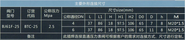 適用范圍 適用于公稱壓力為2.5MPa.公稱通徑為DN4和DN6.進(jìn)口插焊連接、出口螺紋連接、閥體材料為鋼質(zhì)的插焊連接直通壓力表閥?! ¢y門屬性 公稱壓力為2.5MPa,試驗壓力為3.8MPa,適用溫度為-50。C-+200。c.適用介質(zhì)為氨、氟等。 B表示表閥,T表示結(jié)構(gòu)形式為直通式,c表示插入焊連接,2 5代表公稱壓力為2.5MPa,25后不標(biāo)注代表代表閥體材質(zhì)為鍛鋼。