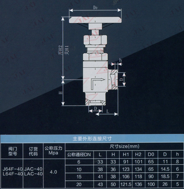 J表示截止閥 L表示節(jié)流閥 A表示結構形式為直角式 C表示插焊連接 40代表公稱壓力為4.0MPa 40后不標注代表代表閥體材質為鍛鋼。